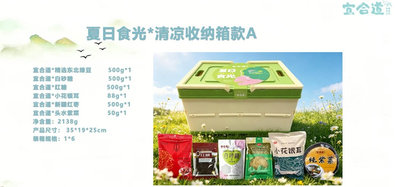 宜合道*精选东北绿豆 500g*1 宜合道*白砂糖 500g*1 宜合道*红糖 500g*1 宜合道*小花银耳 88g*1 宜合道*新疆红枣 500g*1 宜合道*头水紫菜 50g*1 净含量:2138g 商品条形码:6972940014956 产品尺寸: 35*19*25cm