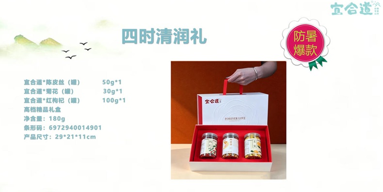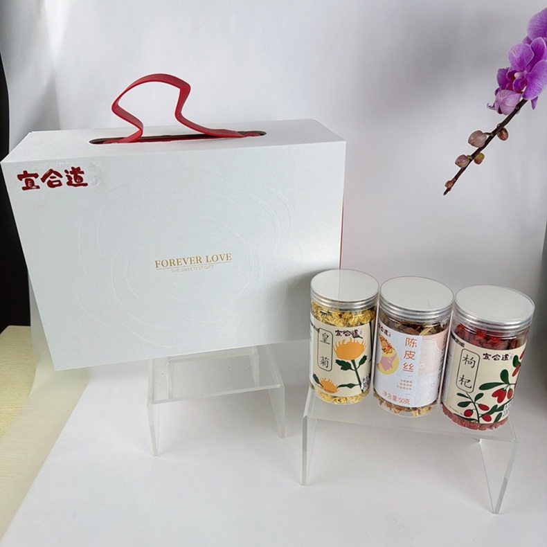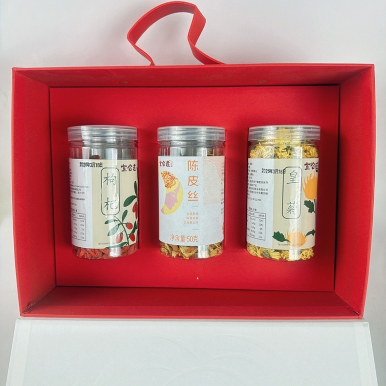 宜合道*陈皮丝(罐) 50g*1 宜合道*菊花(罐) 30g*1 宜合道*红枸杞(罐) 100g*1 精品礼盒 净含量:180g 条形码:6972940014901 产品尺寸:29*21*11cm