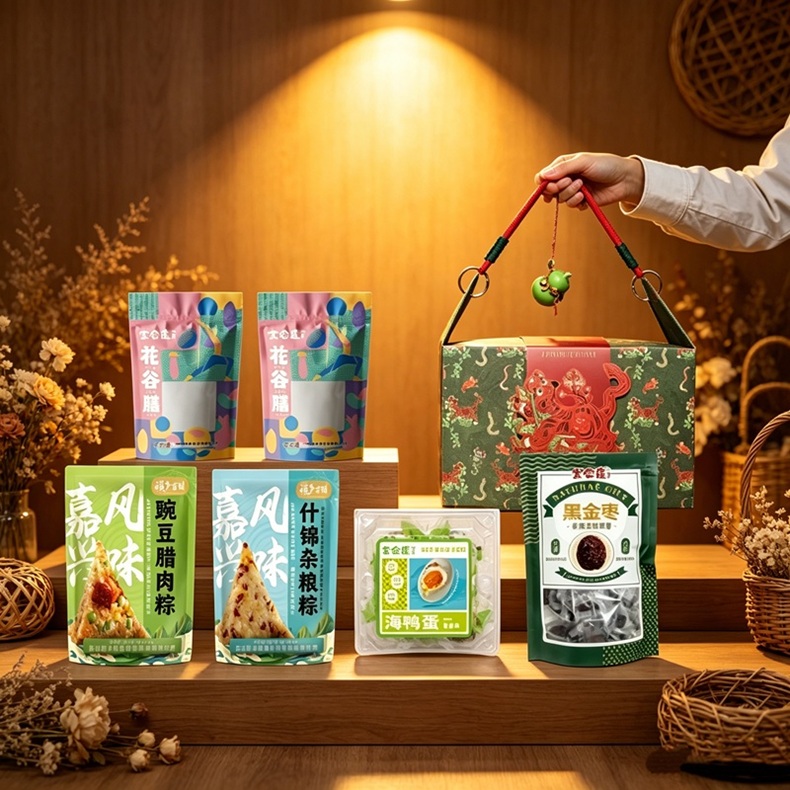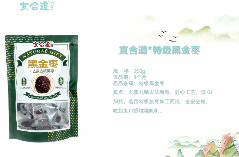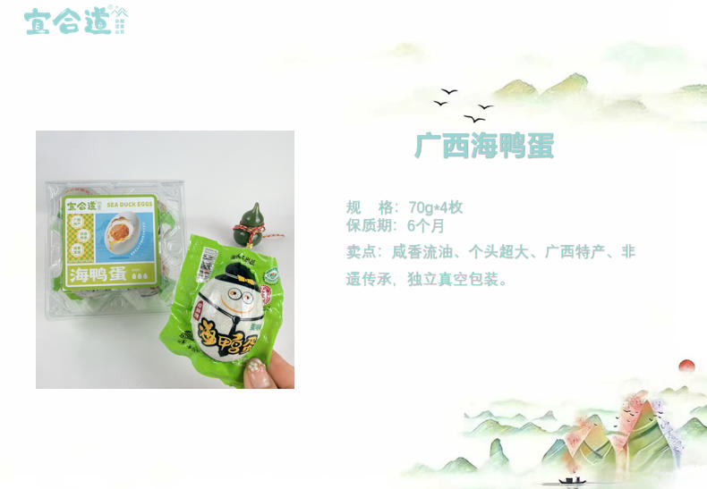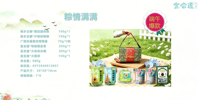 粽乡古镇*豌豆腊肉粽 100g*1 粽乡古镇*什锦杂粮粽 100g*1 广西非遗真空海鸭蛋 70g*4枚 宜合道*特级黑金枣 200g*1 宜合道*大块老冰糖 200g*1 宜合道*大麦茶 100g*1 净含量:980g 条形码:6972940013867 产品尺寸: 30*20*18cm