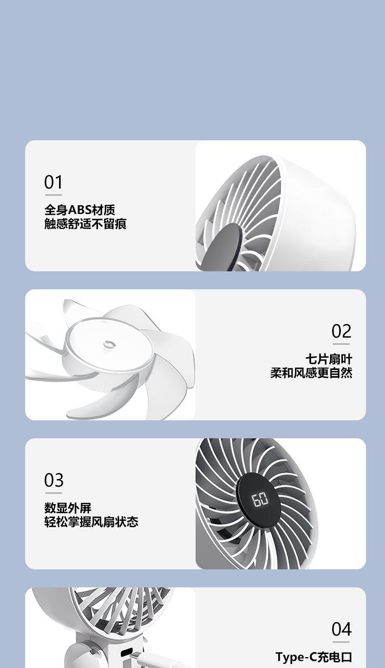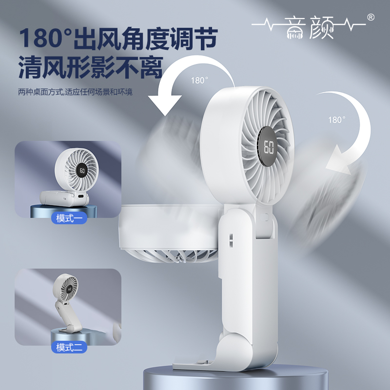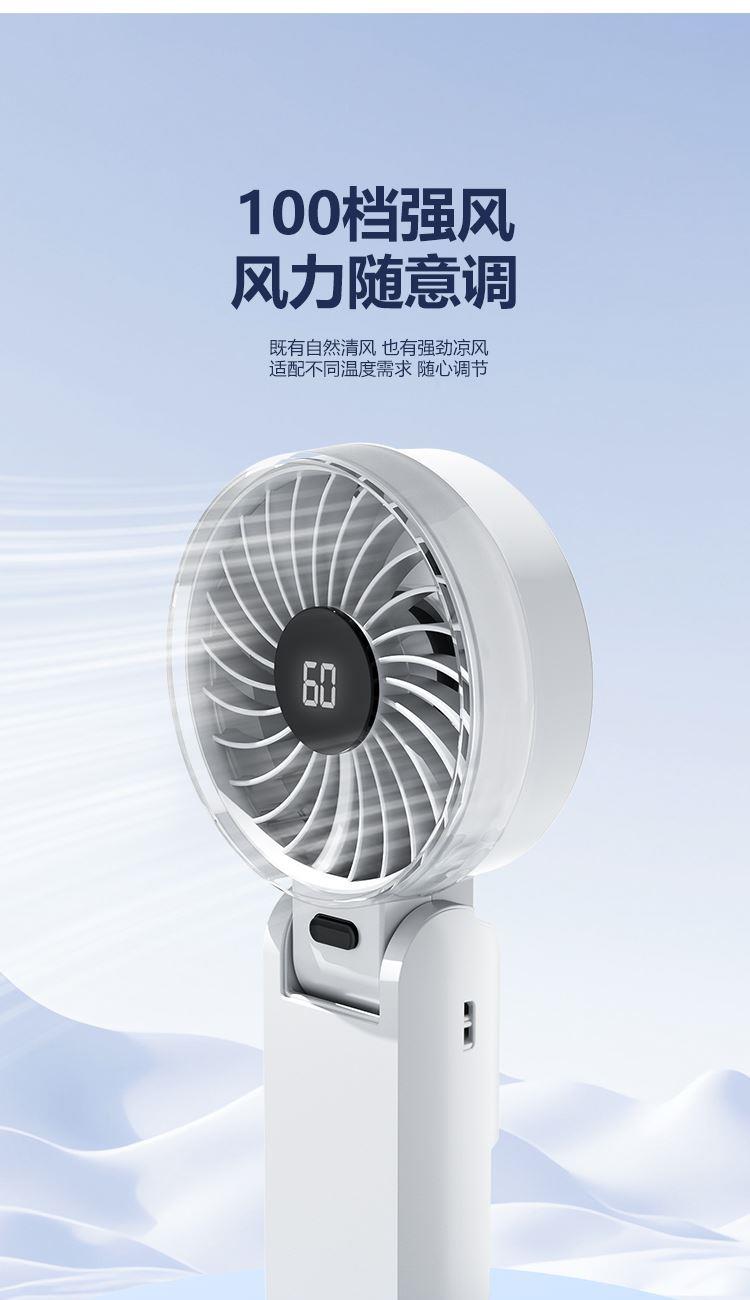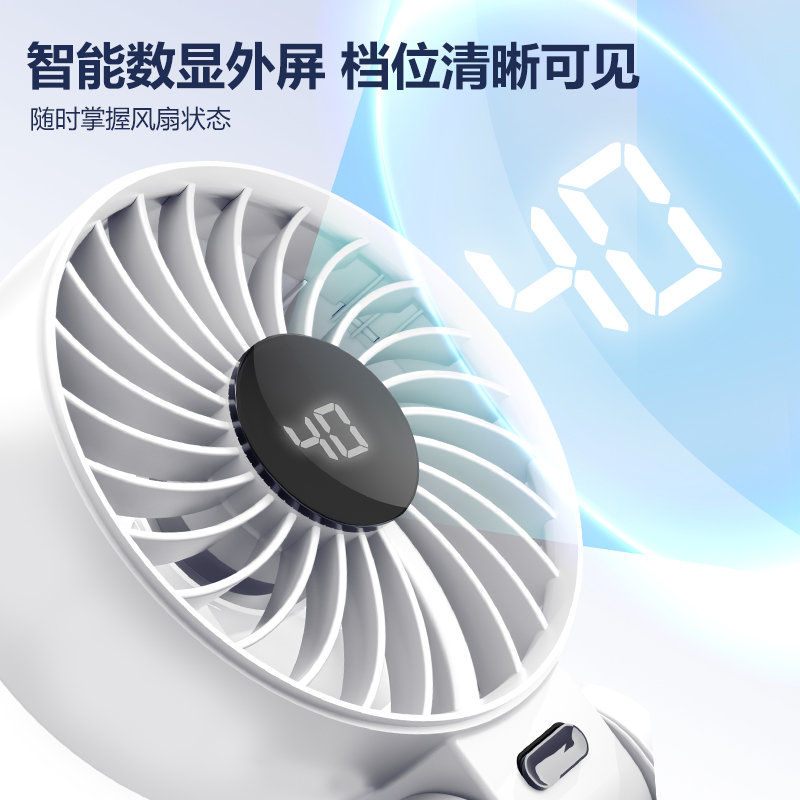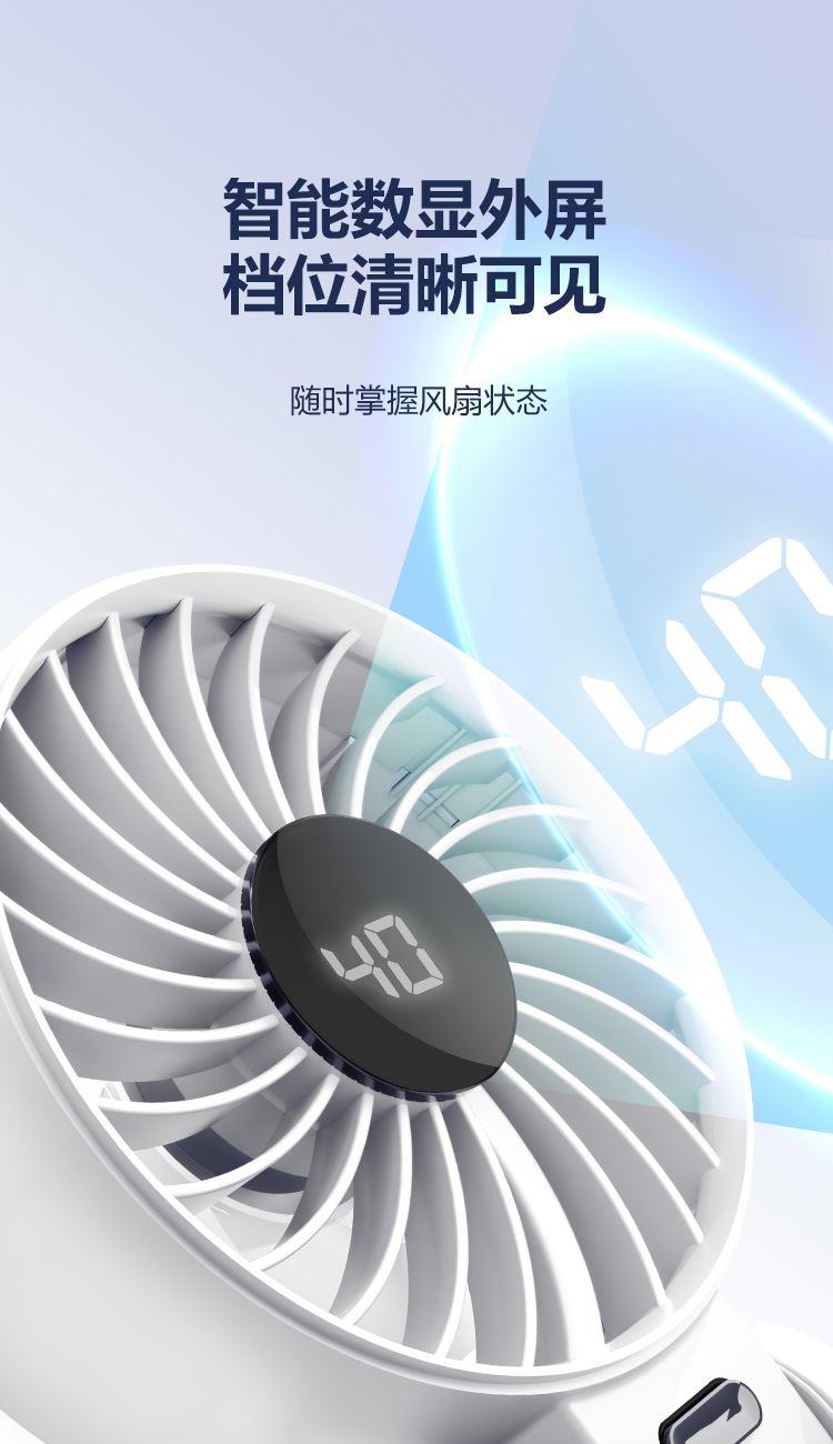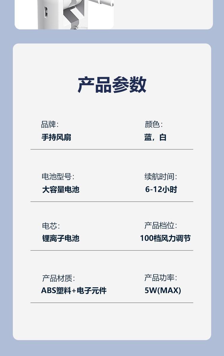 【推荐理由】: 可挂背包,可立桌面,多场景 100档无极变速,LED风速显示 可上下调节角度 精致小巧,方便携带 颜色:白色 蓝色 尺寸:195*83*40mm 容量:1800mAh 包装:彩盒包装