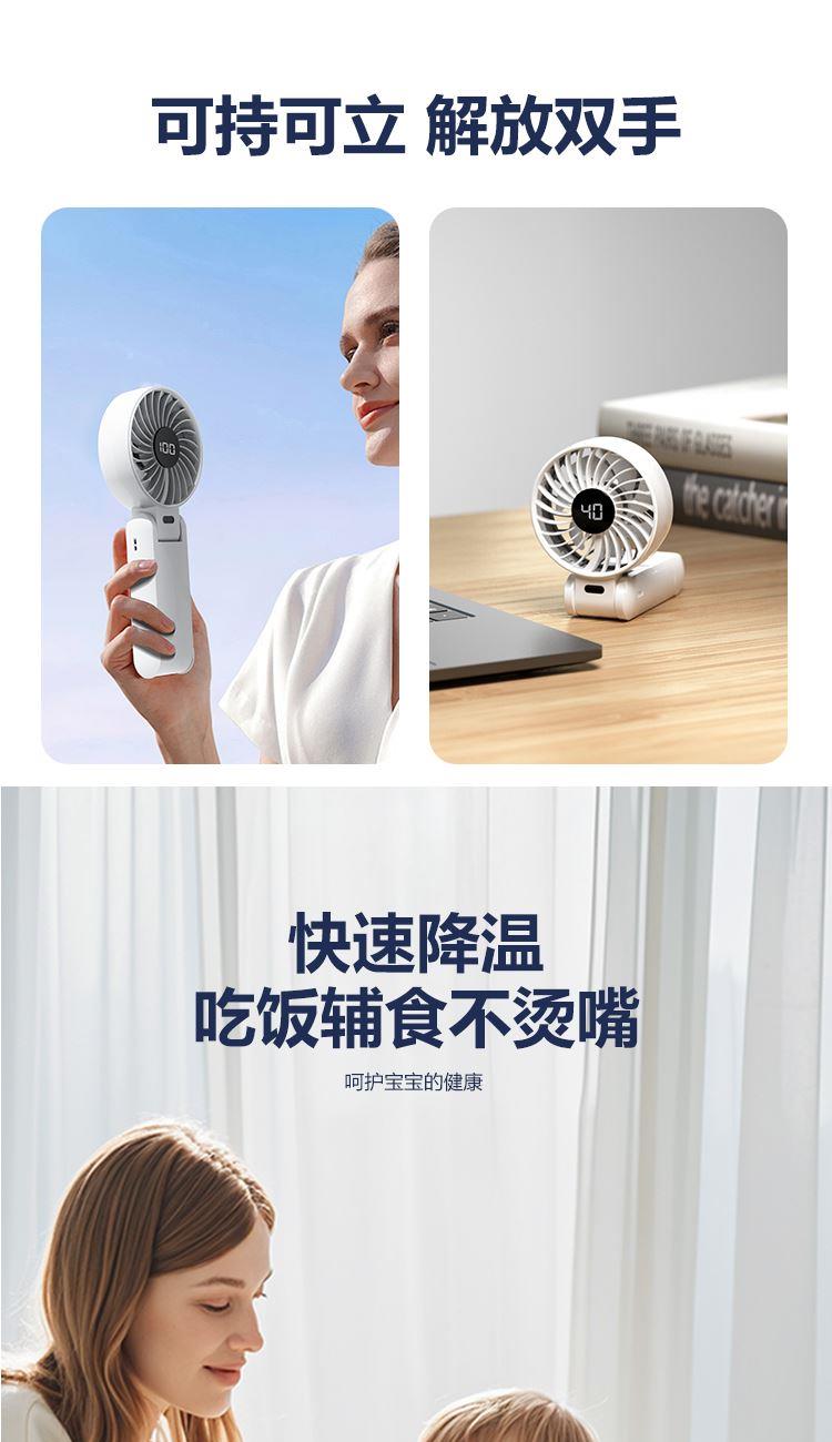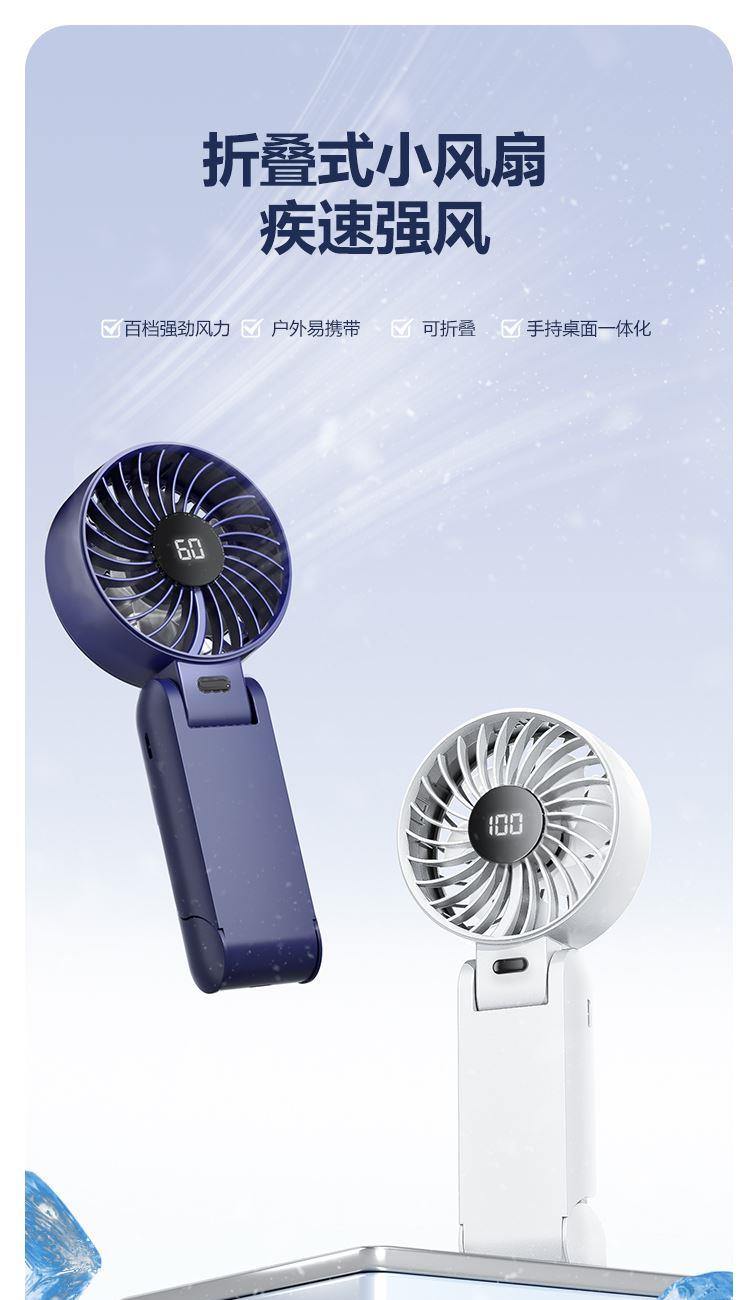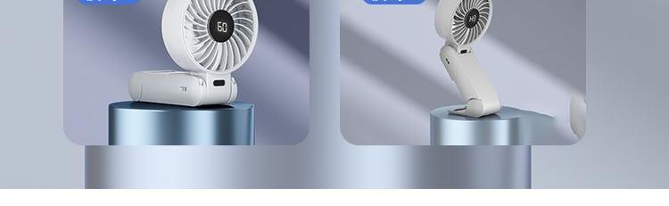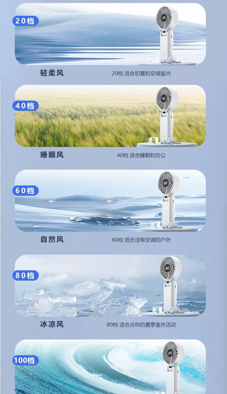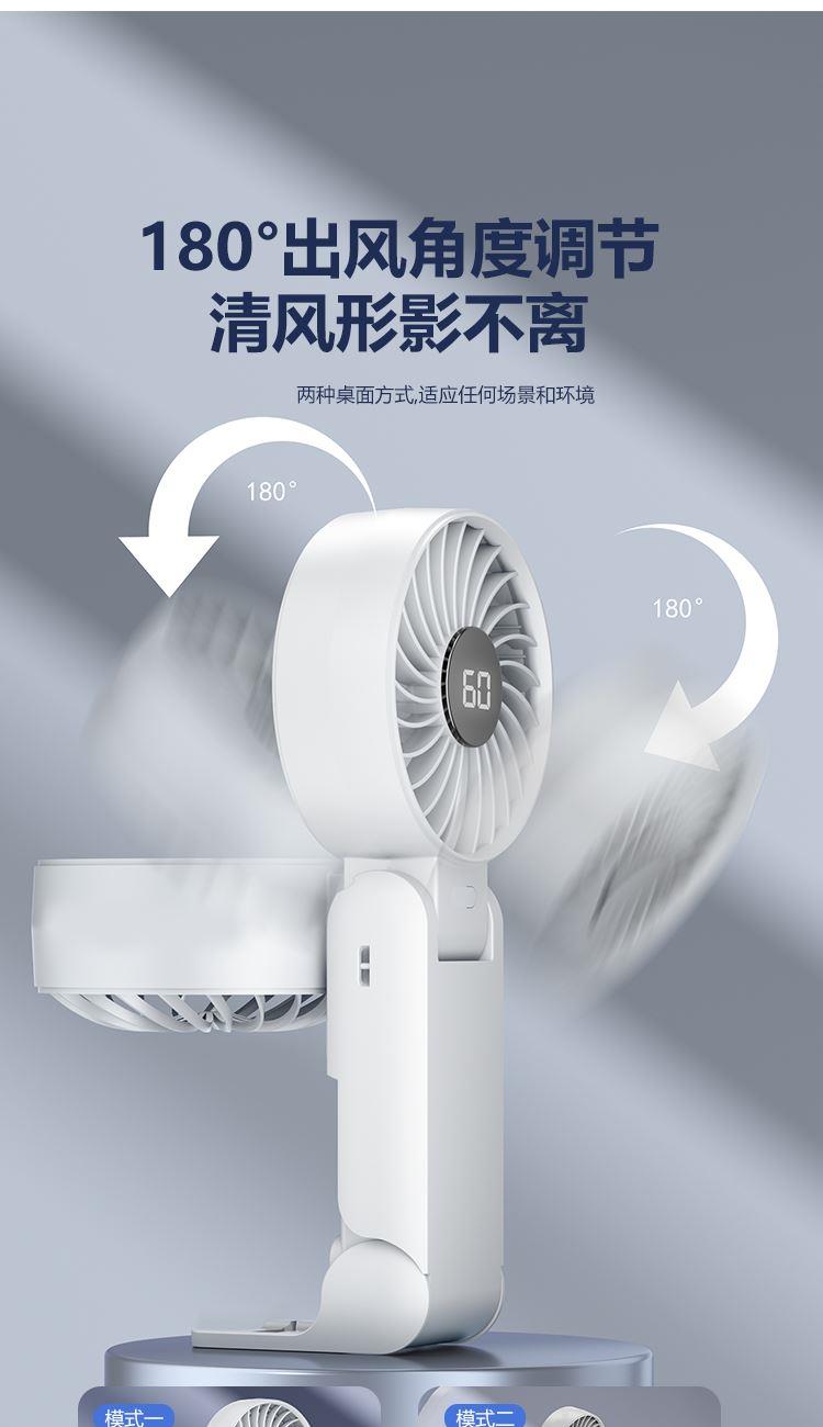 【推荐理由】: 可挂背包,可立桌面,多场景 100档无极变速,LED风速显示 可上下调节角度 精致小巧,方便携带 颜色:白色 蓝色 尺寸:195*83*40mm 容量:1800mAh 包装:彩盒包装