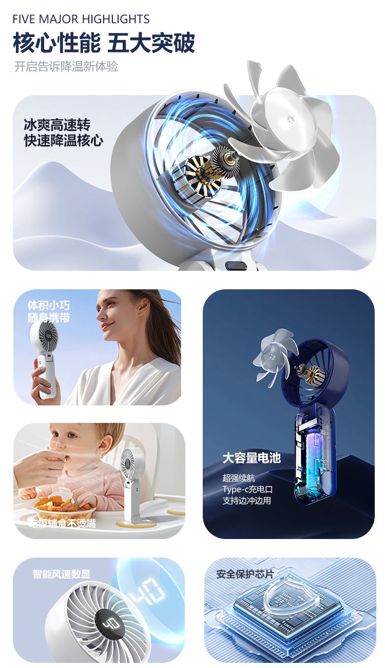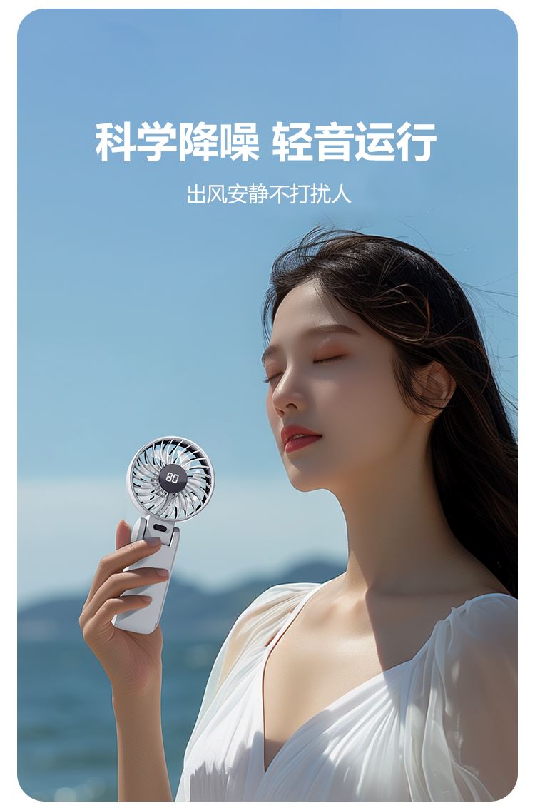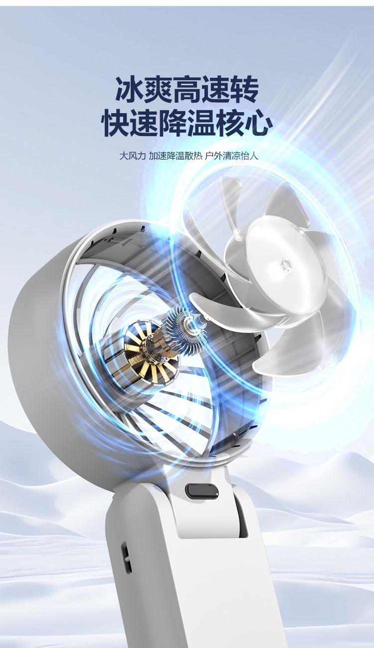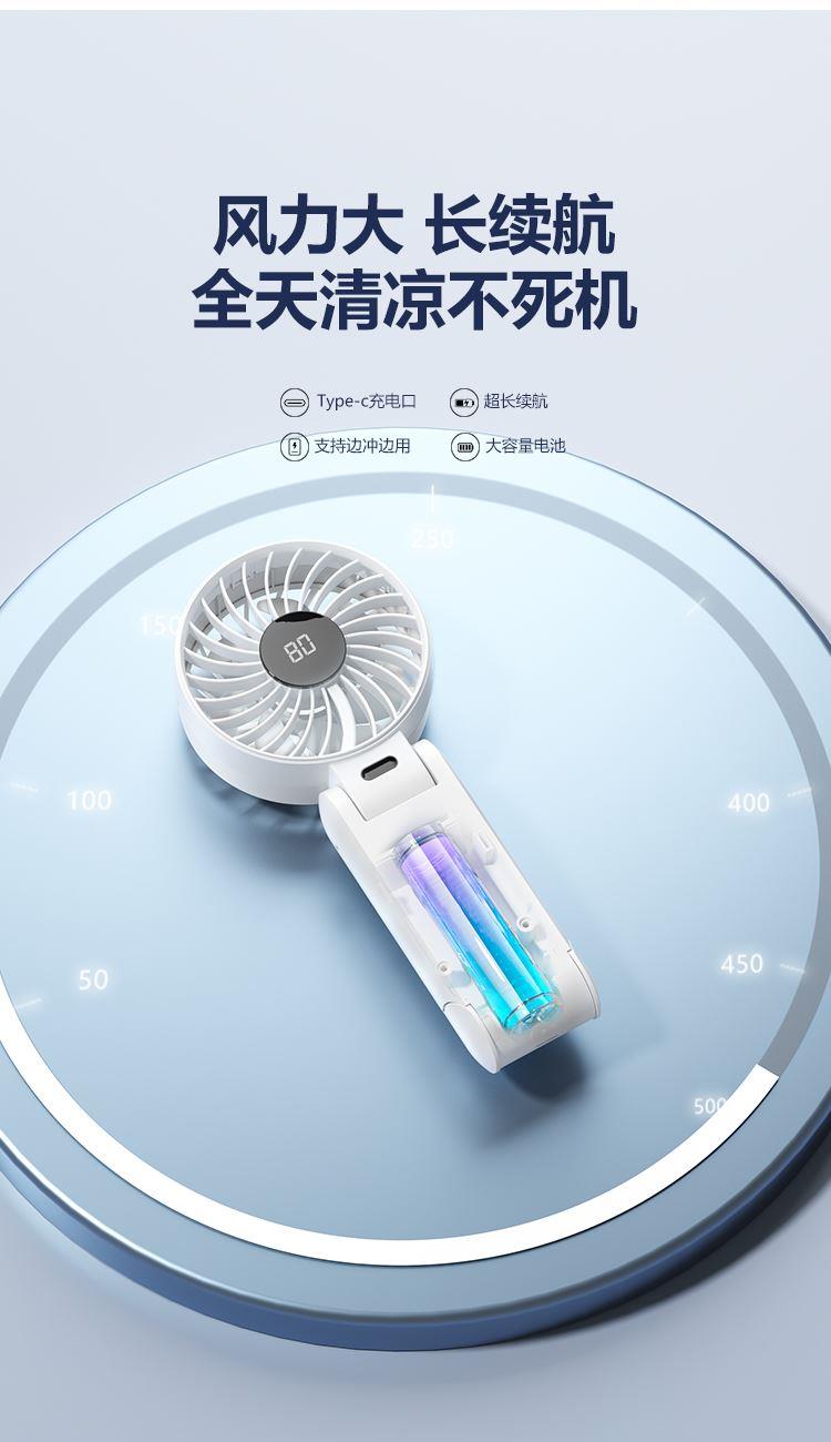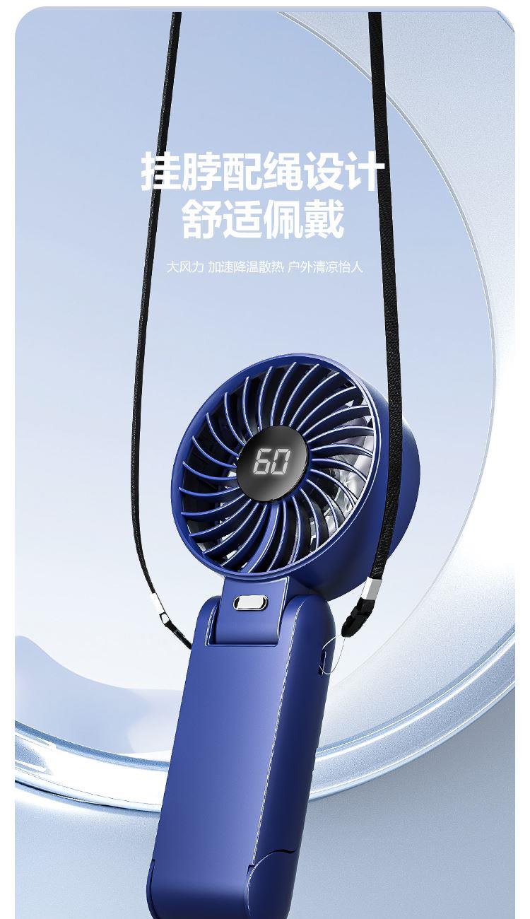 【推荐理由】: 可挂背包,可立桌面,多场景 100档无极变速,LED风速显示 可上下调节角度 精致小巧,方便携带 颜色:白色 蓝色 尺寸:195*83*40mm 容量:1800mAh 包装:彩盒包装