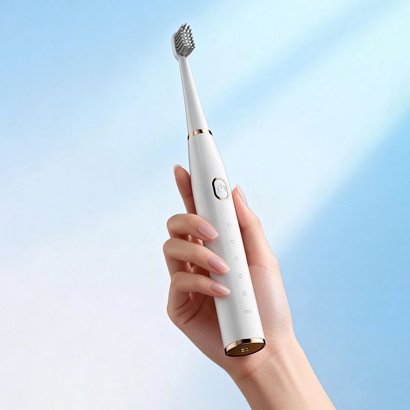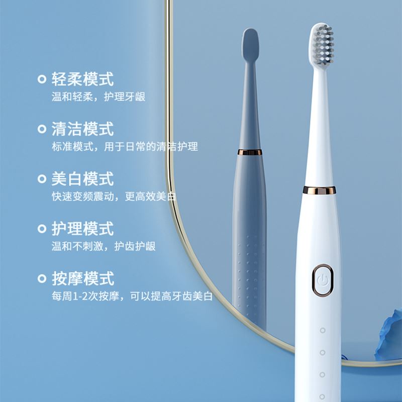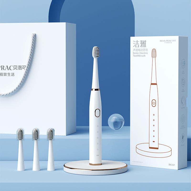 专业洁齿实力派,声波电动牙刷 3D立体裁剪刷头,高密度植毛,羽毛般体验,呵护敏感牙龈 定时提醒,每一秒都很贴心,早晚两分钟,刷出净白笑容 一键切换五大智能模式,适合不同人群需求 利用声波共振原理,深层清洁牙齿表面和牙缝间残渣、污垢 开机不震手,不伤牙龈,力度刚刚好 体积小巧,持久续航,USB便携直冲,旅行无忧 IPX7防水性能,全身可水洗 礼盒包装,赠送三只备用刷头 产品型号:BK337 产品材质:ABS+PP 电池容量:500mAh 额定输入:5.0V(交流电)/1W 礼盒尺寸:26.5*11.2*4cm 外箱尺寸:47.5*44*44cm 执行标准:GB39669-2020;GB/T40362-2021 产地:浙江