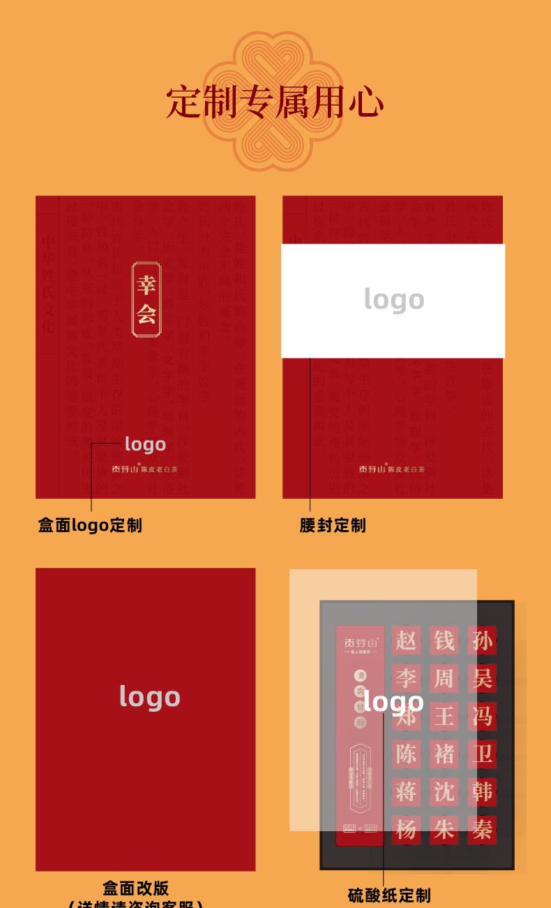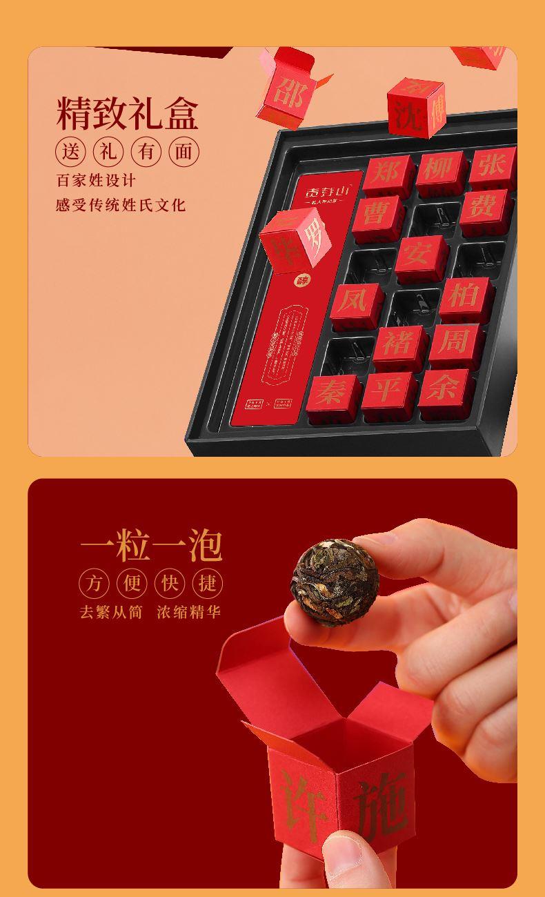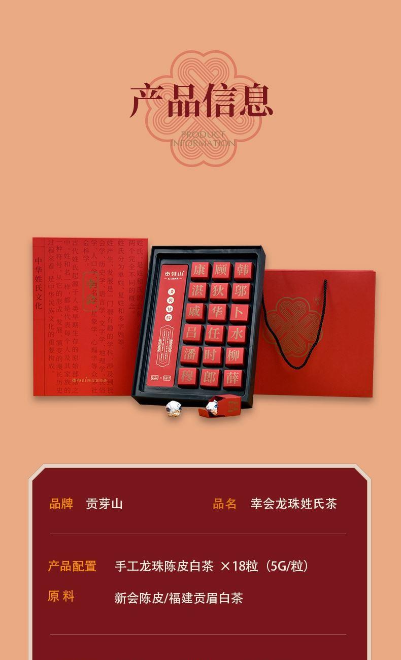 幸会·请多关照,热情的礼敬打破初见的陌生 108姓,用姓汇来制造与众不同的话题 配置 · ① 陈皮老白茶龙珠×18颗 ⑤ 礼盒×1套 ⑥ 心意手袋×1只