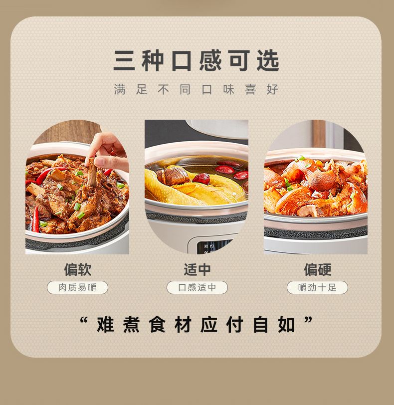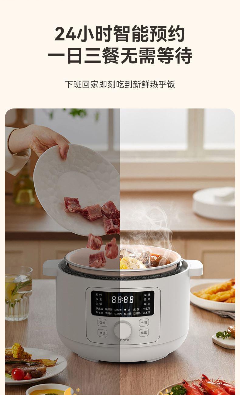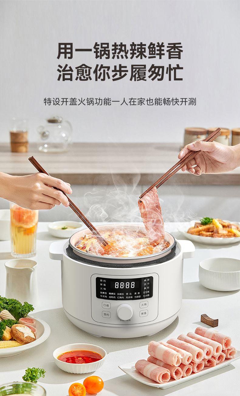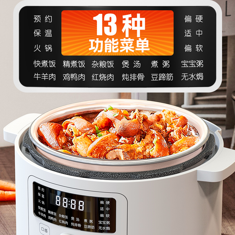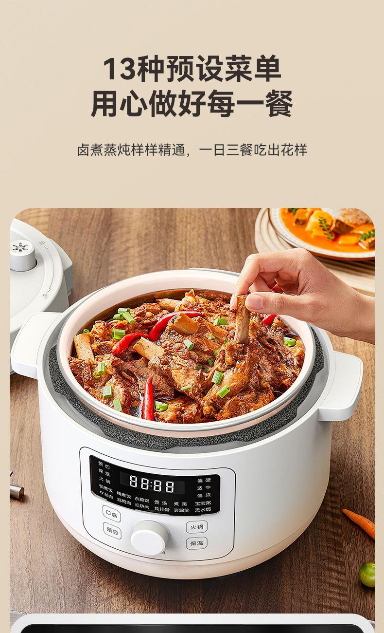 额定功率:1200W 额定容量:4.0L 鸳鸯内胆、食品级陶瓷油不粘涂层、13大菜单、24小时智能预约、24小时保温、一键泄压功能、防干烧/高温自动断电、保压、保温功能、双耳提手提拿便携不烫手、全塑机身和锅盖防烫防损、免费赠送蒸笼 包装方式:彩包+邮购箱