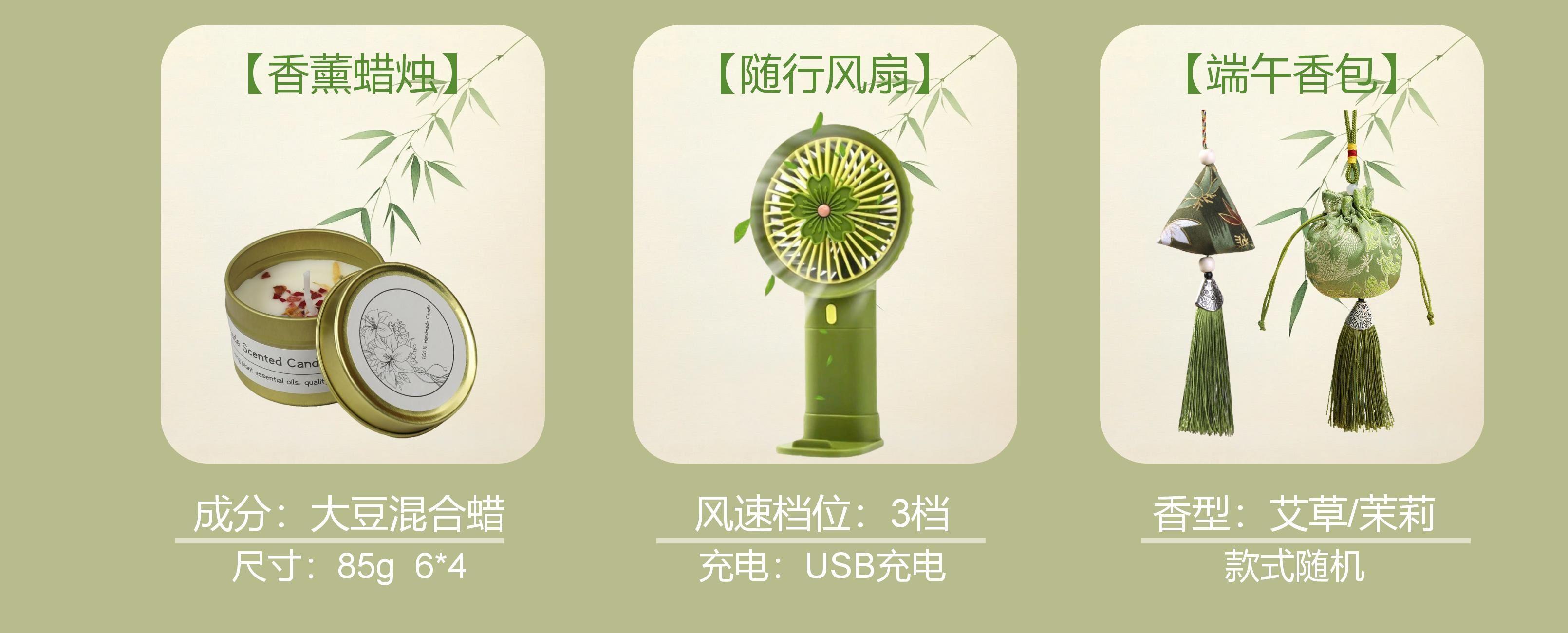 真真老老经典鲜肉粽130g*1 真真老老红袍豆沙粽130g*1 迪乐贝尔高硼硅吸管杯390ml 绿色小花随行风扇(三档风+usb) 端午沐浴泡脚蕲艾草饼*2 天地盖礼盒+手提礼袋 端午腰封/卡片+端午风物吊牌/流苏 礼盒尺寸:20*18*8cm