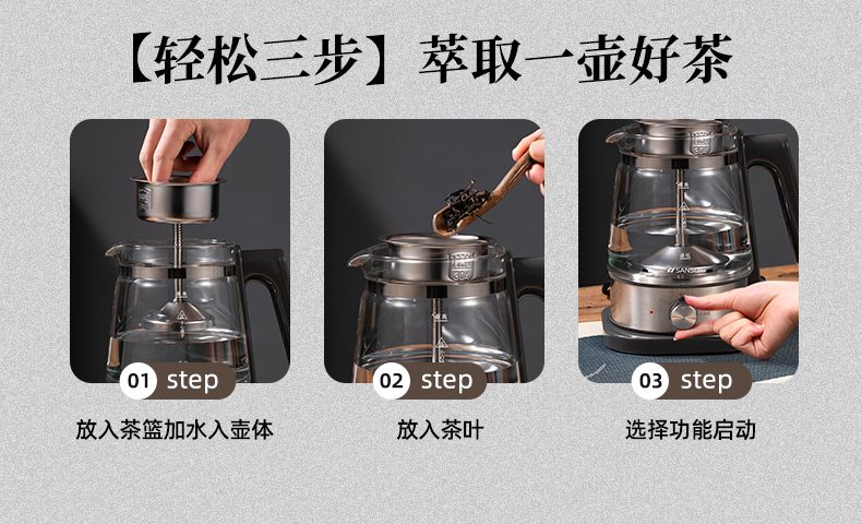 容量:1.3L 功率:600W 蒸汽喷淋萃取泡茶、茶水分离、1.3L大容量、高硼硅玻璃、食品级304不锈钢茶漏、食品级304不锈钢发热盘和上盖、旋钮操作四大功能轻松选、24小时长效保温功能、大口径设计方便清洁、600W大功率、分体式设计清洗便捷 包装方式:彩包+网购包装